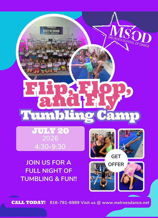 Join us for a night of amazing and creative tumbling. At Flip, Flop, and Fly acro camp you will learn creative ways to tumbling, partnering tricks, limber ticks, and power tumbling. We focus on strength, flexibility, acro techniques, and many tumbling skills. Call for more information at 816-781-6989.